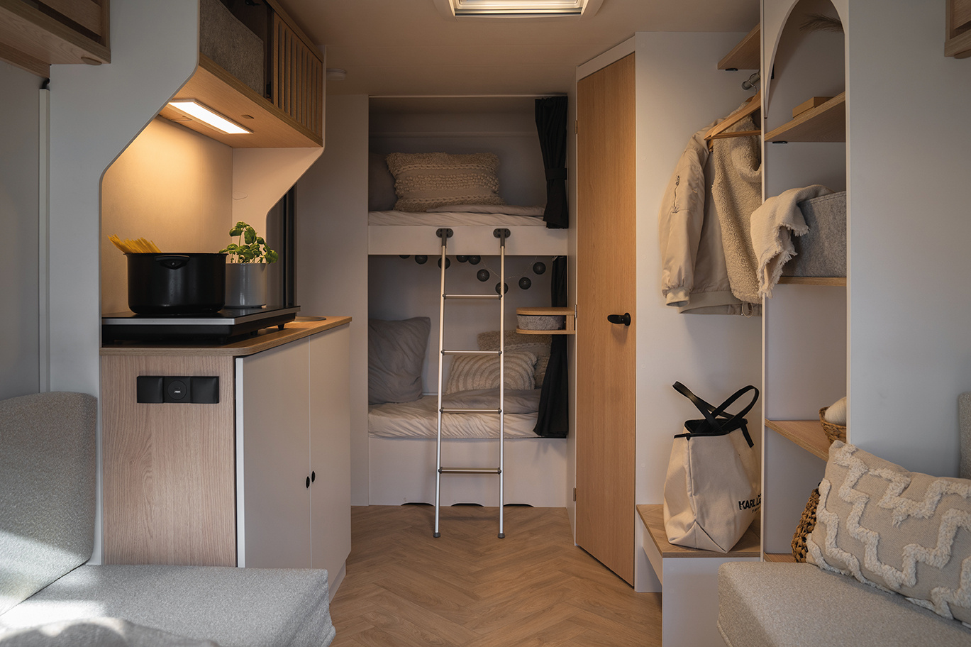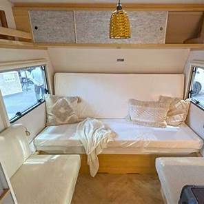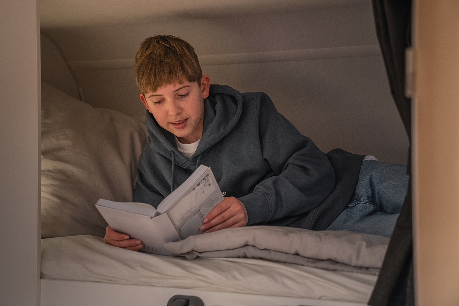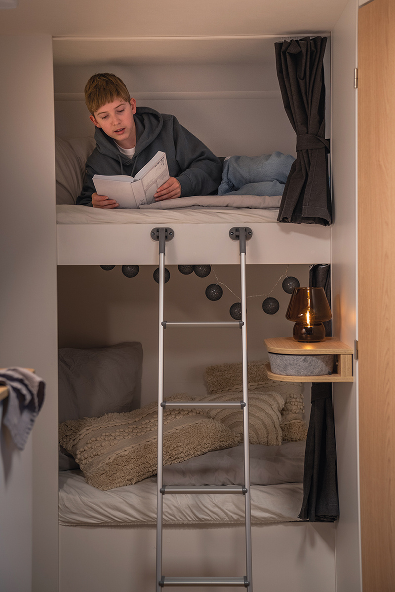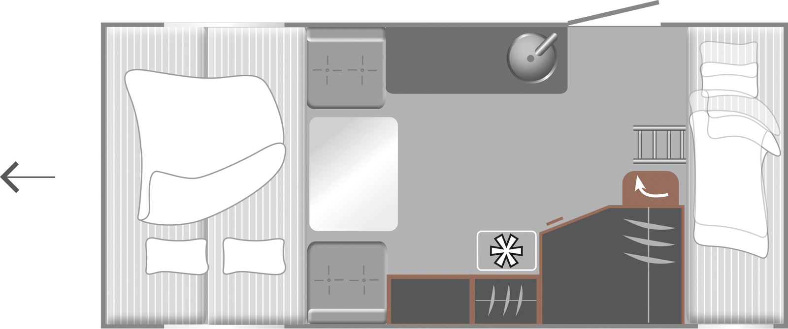 Fest-Doppelbett vorne , quer, auch als Einzelbetten längs nutzbar